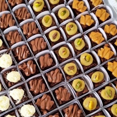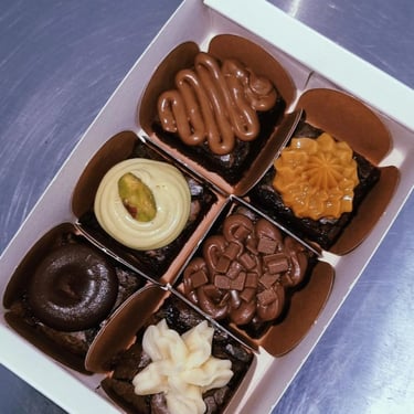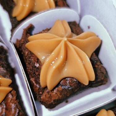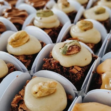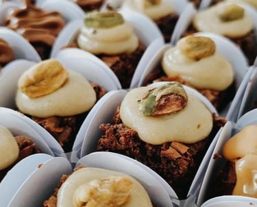 São mini brownies no tamanho 2,5x2,5 que vão em forminhas quadradas na cor escolhida por você, e temos de opção diversos sabores diferentes como Pistache, Ovomaltine, Meio Amargo, Nutella, Doce de leite, Ninho, Ao leite, Chocolate branco, 70% cacao, Caramelo salgado ou Tradicional (apenas nosso brownie perfeito, sem cobertura na forminha quadrada.)