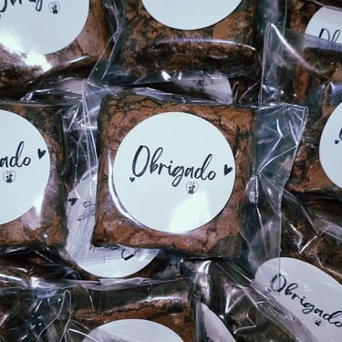 Temos opção de mini brownies para mesa de doces (que dará um charme super especial pra sua festa) ou então no formato individual, com adesivo ou tag personalizada para dar de lembrancinha aos convidados ao final do evento.
